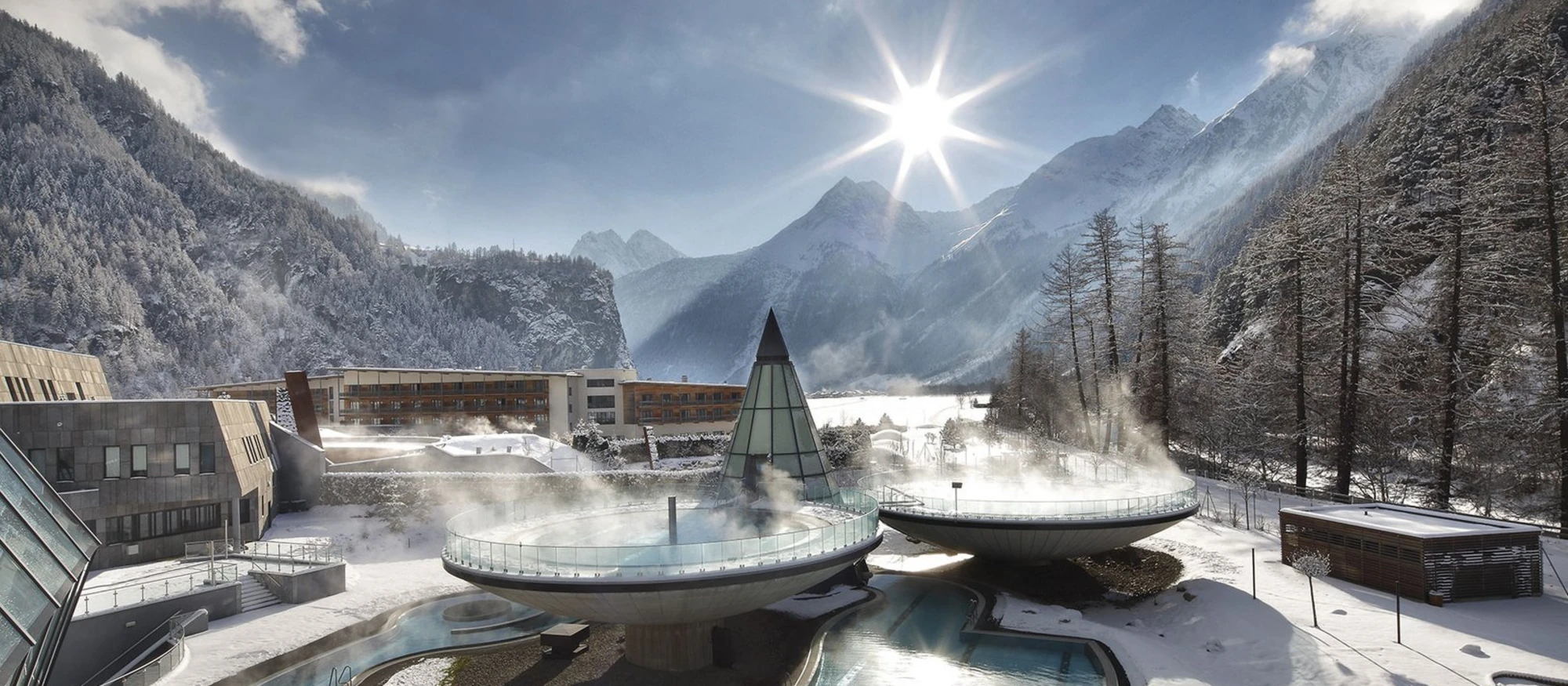 - Thermen-Außenbereich „Talfrische“ mit zwei Flussbecken und drei auf Stelzen stehenden Thermenschalen