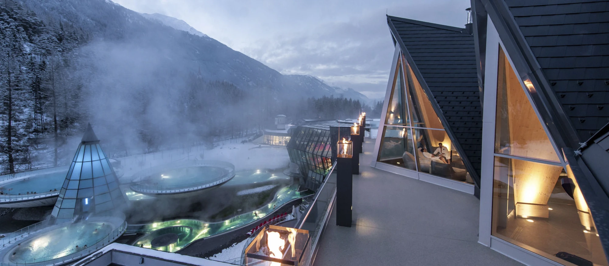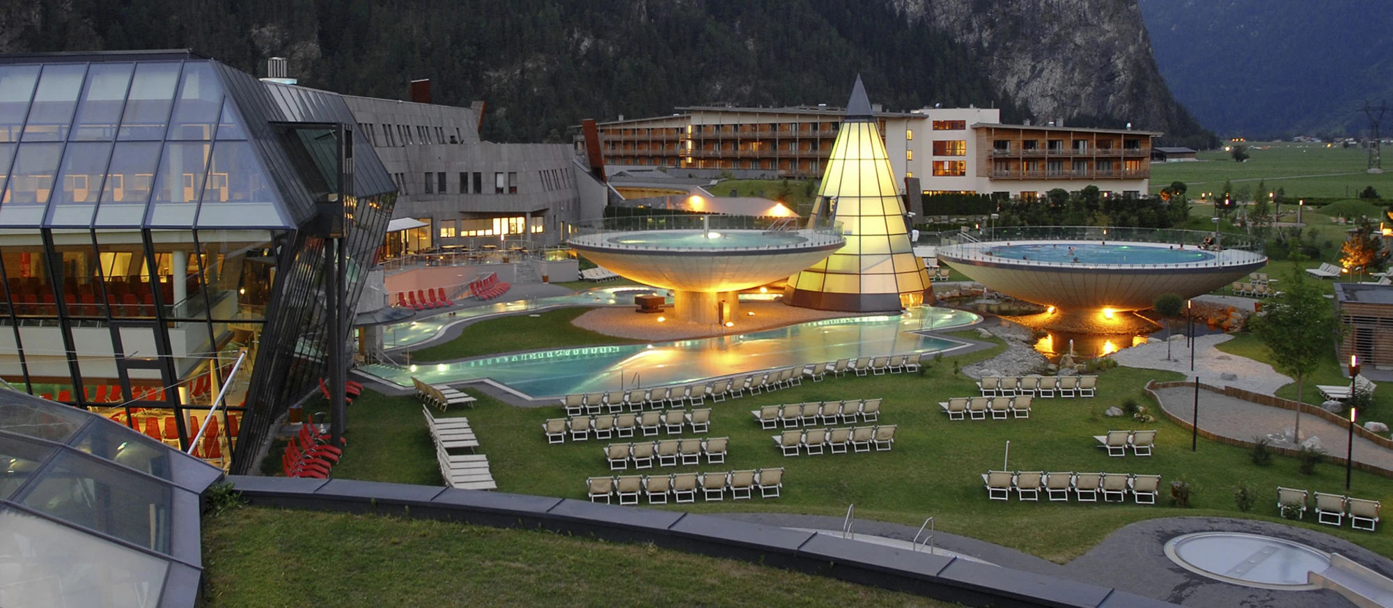 - Saunawelt „Gletscherglühen“ mit zweigeschossiger Loft-Sauna, finnischer Erdsauna, Schluchtensauna, Heustadlsauna, Kräuterkammer, Solegrotte, Solebad, Dampfdom, Solarien, Eisgrotte, Wasserfall, Kaltbecken und Freiluftpool