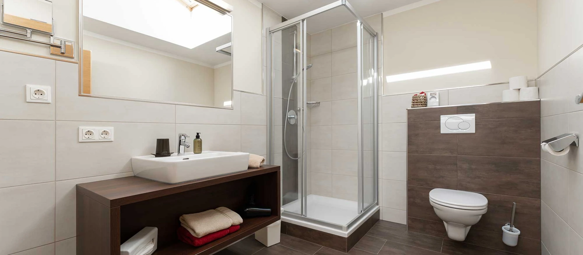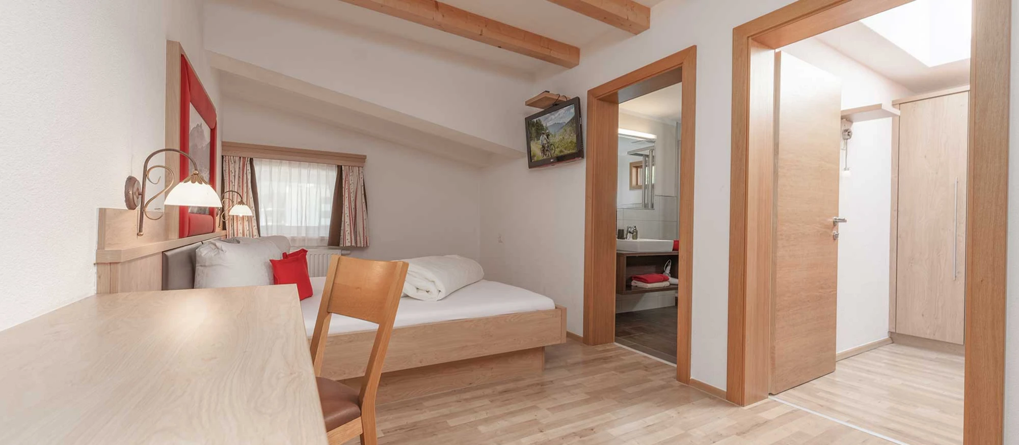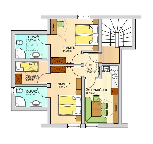 Unsere Familienappartement im Dachgeschoß ist ca. 58 m² und und bietet genügend Platz für bis zu 4 Erwachsene und 2 Kinder. Diese Appartement hat einen Sichtdachstuhl mit Dachschrägen die an 2 Stellen nur 1,75 m sind. Es verfügt über einen Wohn-, Kochbereich mit Dachfenster ,2 Doppelzimmer mit ca. je 17 m² und 1 Nebenzimmer mit Hochbett ca. 4,5 m² und Dachfenster.