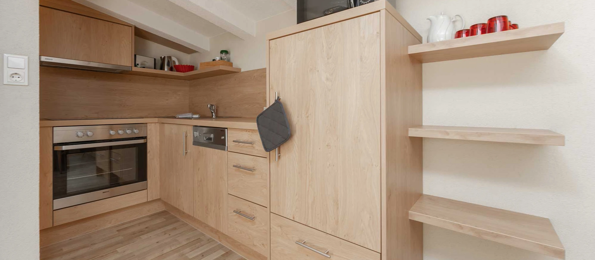 Kühlschrank, Kochfeld, Elektroherd, Wasserkocher, Toaster, Mikrowelle, Spülmaschine, sowie einer Kaffeemaschine (Kapseln Cafissimo), Geschirr, Geschirrtücher, Digital-TV und einer Tischsitzecke.