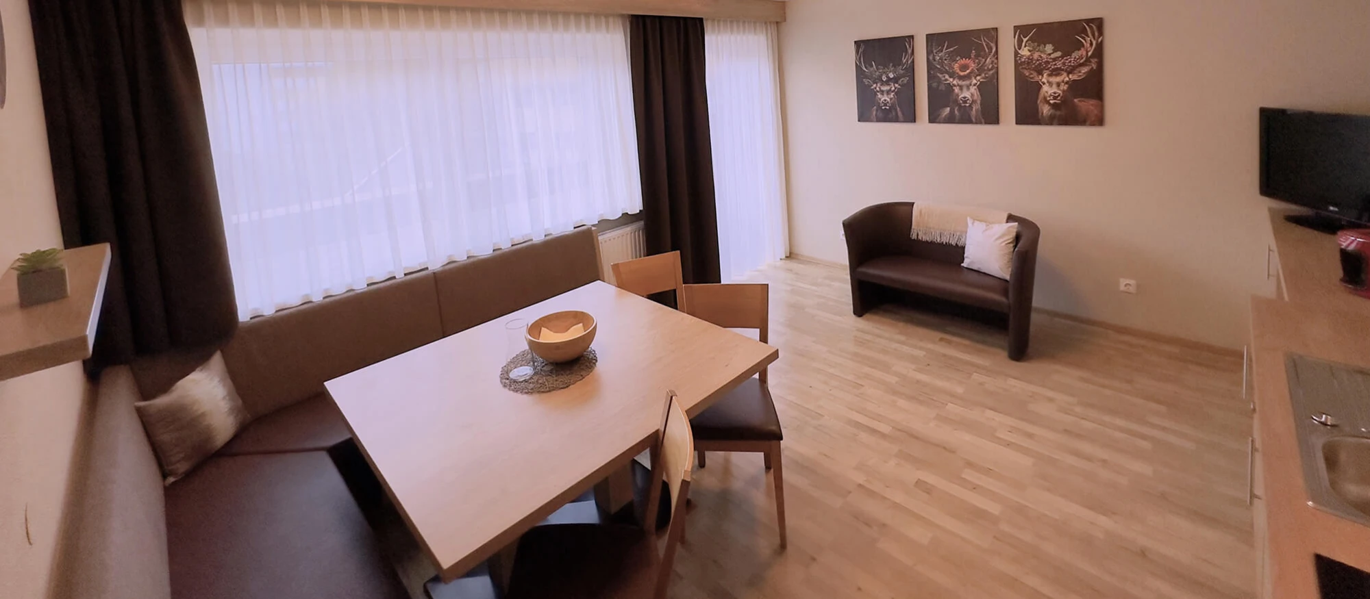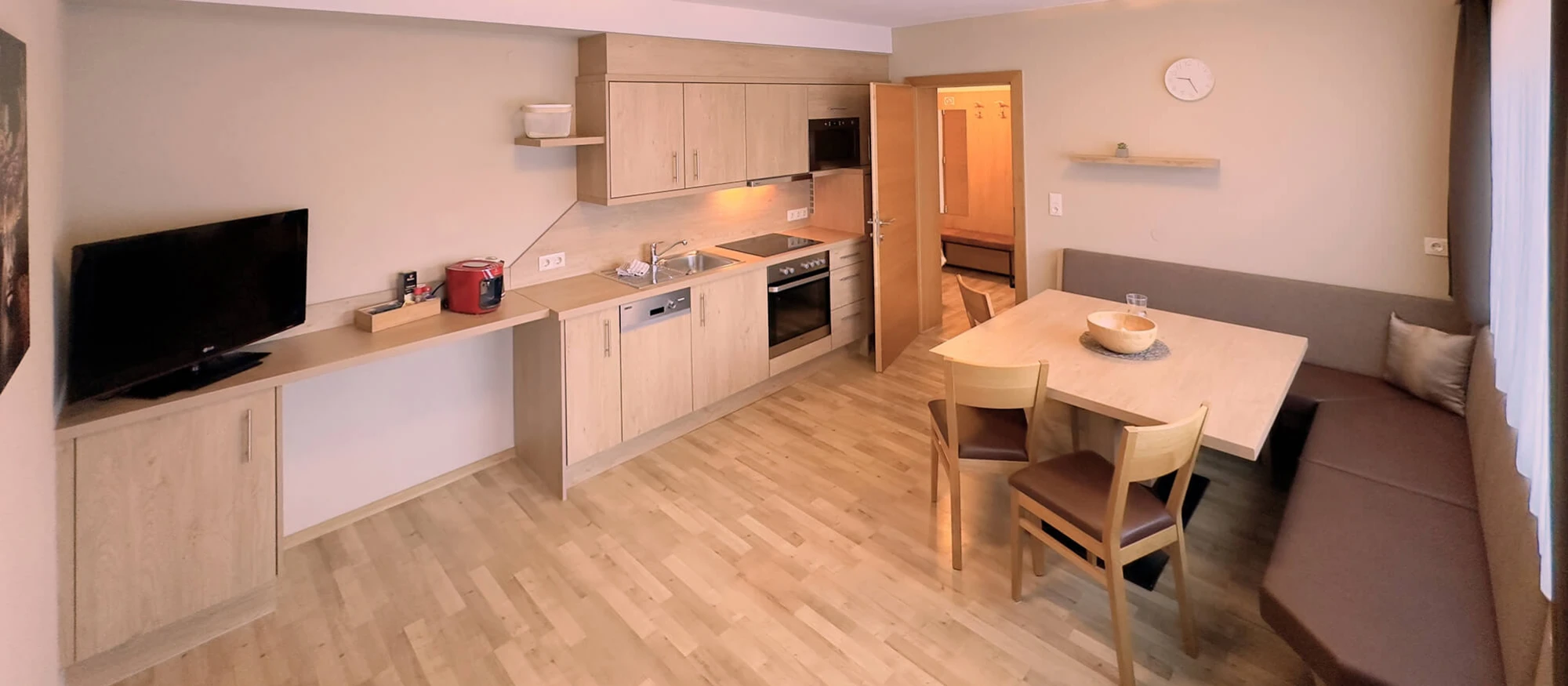 The kitchenette is equipped with: refrigerator, electric stove and oven, water kettle, toaster, microwave, dishwasher, coffee maker (capsules Cafissimo), dishes, dish towels, armchair, digital TV and a table with wrap-around bench and adjacent balcony.