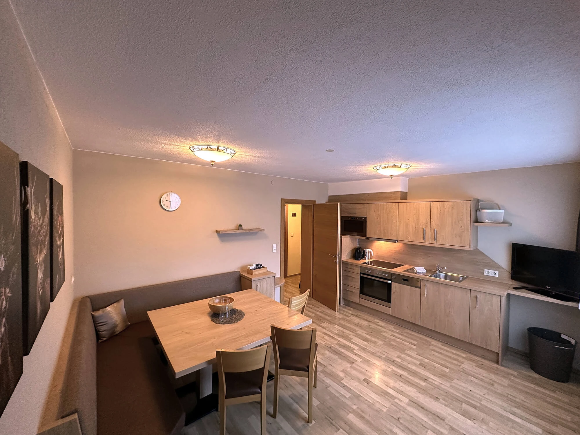 The kitchenette is equipped with: refrigerator, electric stove and oven, water kettle, toaster, microwave, dishwasher, coffee maker (capsules Cafissimo), dishes, dish towels, armchair, digital TV and a table with wrap-around bench and adjacent balcony.