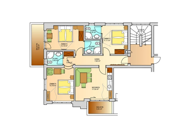With a total floor space of 80 m2 (861 ft2) this apartment sleeps 6 people. It features a living/dining room with kitchenette and three double rooms. The bedrooms are approximately 16.5 m2 (172 ft2) each.